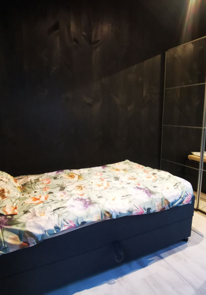 Modell Lofoten ble her levert med en gjennomgående moderne hyttestil i naturlig treverk og sorte detaljer, etter kundens ønske for finish. PVC kledningen er i eik farge, og innvendig er trepanelene beiset i fargen "dempet hvit".